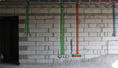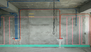 所有管線整齊排列在天花上,用專用管碼吊在天花上,所有墻面線管豎直向下
